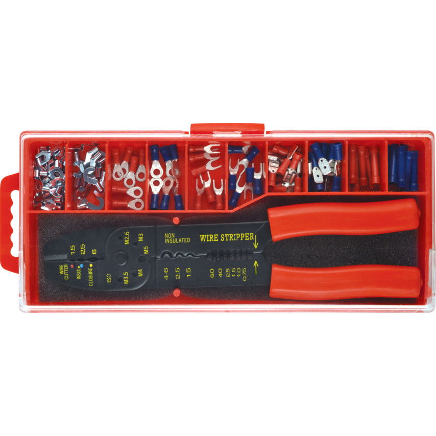 - A készletet 100 db-os szigetelt és szigeteletlen kábelsaru szortiment egészíti ki, átlátszó fedelű műanyag dobozban.